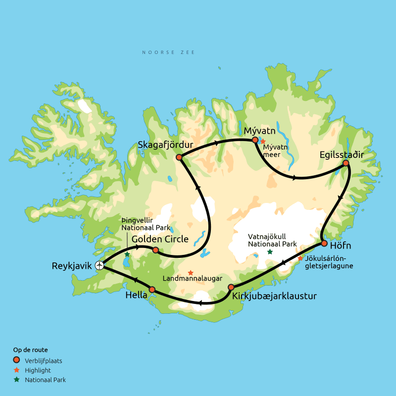 U stapt in het vliegtuig naar IJsland, uw vakantie begint! Op de luchthaven haalt u uw huurauto op en rijdt u in ongeveer 45 minuten naar de hoofdstad van IJsland. Reykjavik is de grootste en meest bevolkte stad van IJsland, waar iets meer dan een derde van de totale IJslandse bevolking woont. Afhankelijk van uw aankomsttijd kunt u alvast een kijkje nemen in deze stad, die uitstekend te verkennen is te voet of per fiets.