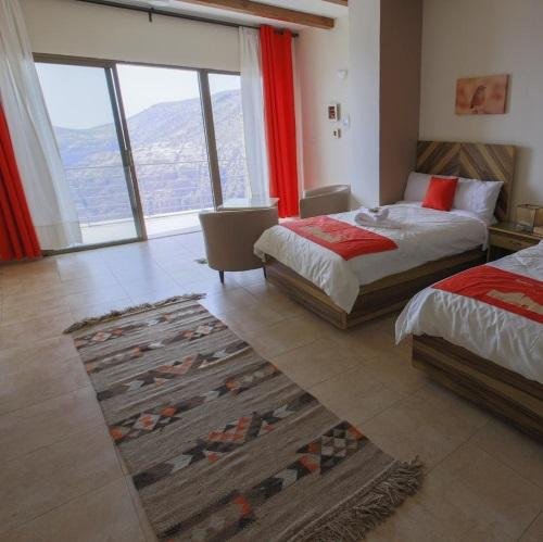 Dit prachtige resort is gelegen in Wadi Musa, met uitzicht op de Louise Mountains en het mysterieuze plaatsje Petra in de directe omgeving. Een perfecte uitvalsbasis voor uw bezoek aan dit bijzondere gebied van Jordanië. In dit hotel hangt een gemoedelijke sfeer en door de warme gezellige inrichting zal u zich snel thuis voelen.Het resort is gelegen op een rustige locatie. Toch verblijft u op minder dan 10 minuten rijafstand van de ingang van Petra. De locatie is ideaal als u beschikt over een auto. Er is onder andere een zwembad, 24-uursreceptie, gratis Wifi en een restaurant waar u uitstekend bereidde maaltijden nuttigt. In de tuin is een buitenzwembad aanwezig met zonnebedden. In het hele resort zijn diverse zitjes, waar gasten kunnen ontspannen en genieten van een verfrissend kopje muntthee of Arabische koffie terwijl u geniet van het uitzicht over de terrassen of een schitterende zonsondergang. U kunt gratis gebruik maken van de Wi-Fi en er is gratis parkeergelegenheid. De kamer is ca. 30 m2 groot en heeft een unieke inrichting, met een marmeren vloer en stenen muren. De kamers zijn voorzien van airco, TV, telefoon, een kluis voor de waardevolle spullen, een minibar en koffie- en theefaciliteiten. Ook op de kamer maakt u gebruik van gratis WiFi. De ruime badkamer heeft een bad of douche, een toilet, een haardroger en gratis toiletartikelen.
