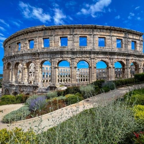 U rijdt ook langs Rovinj, een van de meest geliefde steden van Istrië. Het oude centrum ligt op een schiereiland en wordt gekenmerkt door kleurrijke huizen die dicht tegen elkaar aan zijn gebouwd. Smalle straatjes slingeren omhoog richting de kerk van Sint-Eufemia, die hoog boven de stad uittorent. Boven aangekomen heeft u uitzicht over de rode daken, de Adriatische Zee en de vele kleine eilandjes voor de kust. Beneden aan zee vindt u een levendige promenade met ateliers, cafés en kleine winkels. Rovinj voelt compact, sfeervol en authentiek. Voor de kust van Rovinj ligt het groene eiland Sveta Katarina, dat u ziet liggen terwijl u langs het water wandelt. Het eiland vormt een rustig contrast met de stad en wordt omringd door helder water. In de loop van de avond arriveert u in Pula. Waar u de komende twee nachten verblijft.