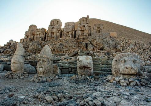 Op de Oost-Terrassen worden we beloond met een van de meest indrukwekkende zonsopkomsten ter wereld. Terwijl de eerste zonnestralen de hemel kleuren, verschijnen de contouren van reusachtige beelden in het zachte ochtendlicht. We staan oog in oog met kolossale stenen hoofden en zittende figuren van dieren en goden als Zeus, Apollo en Hercules, maar ook met het zelfbeeld van koning Antiochus I. De serene stilte op de bergtop, gecombineerd met het spel van licht en schaduw op deze mythische beelden, maakt het moment haast magisch.
