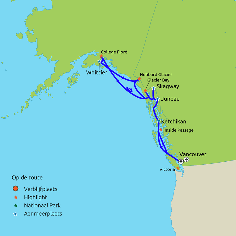 Stap aan boord van een onvergetelijke cruise vanuit het levendige Vancouver en ontdek de ruige schoonheid van Alaska, de 'Last Frontier'. Deze 15-daagse cruise voert u langs adembenemende kustlijnen. Hier kunt u de imposante fjorden en gletsjers, gevormd door duizenden jaren natuurgeweld, van dichtbij bewonderen. Geniet van de serene stilte van het Glacier Bay National Park. Bewonder de kristalheldere wateren van de Inside Passage. En laat u meeslepen door de fascinerende verhalen over de Klondike-goudkoorts en de rijke tradities van de inheemse culturen in plaatsen zoals Juneau en Ketchikan.