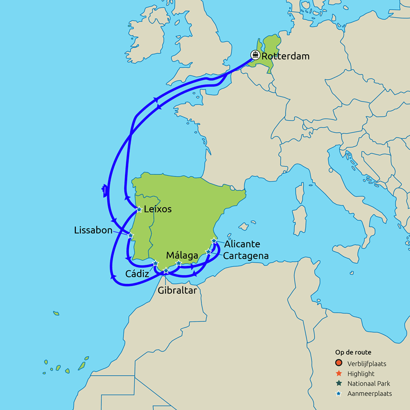 Laat u meevoeren naar het zonovergoten Portugal en Spanje. Geniet in Lissabon van de kleurrijke heuvels, fado-muziek en de iconische gele Pastéis de Belém. In het karaktervolle Cádiz, de oudste stad van Spanje, dwaalt u door Moorse straatjes. Vervolgens wacht het levendige Málaga, geboorteplaats van Picasso, met zijn mix van strand, musea en tapasbars. In het zonnige Alicante komt u heerlijk tot rust aan het goudgele strand of in de schaduwrijke steegjes van de oude stad.