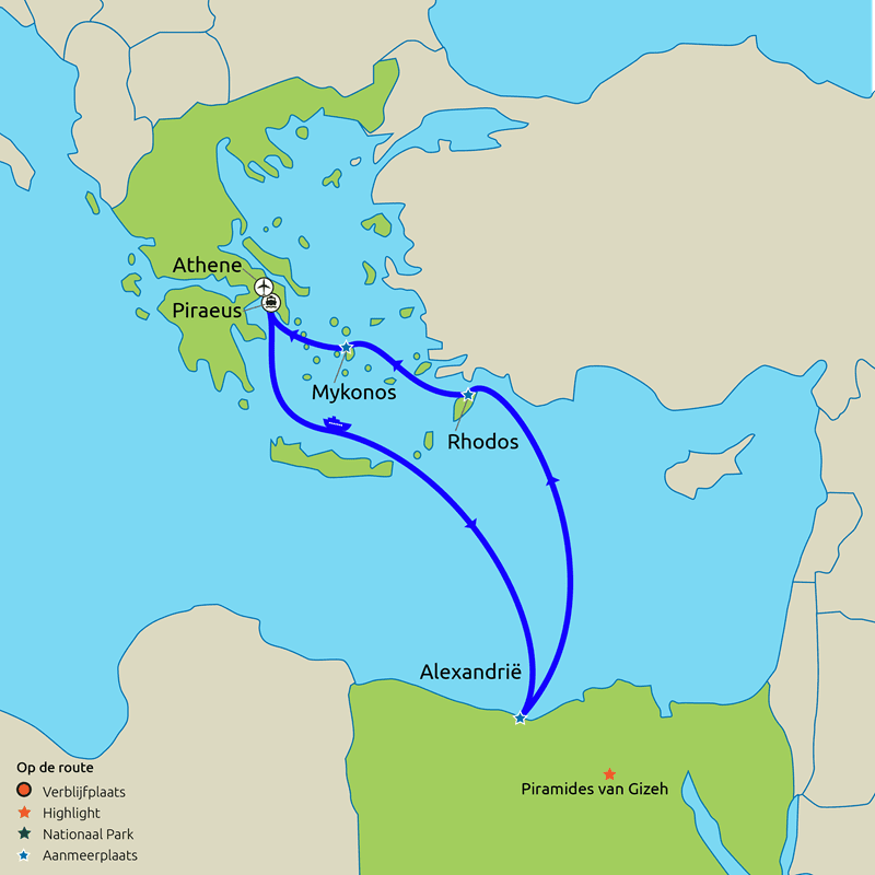 Na deze bijzondere ontmoeting met de Egyptische oudheid zet u koers naar het zonnige Rhodos waar middeleeuwse straatjes en eeuwenoude vestingmuren u meenemen naar een rijk verleden. Vervolgens wacht Mykonos, beroemd om zijn witgekalkte huisjes, sfeervolle straatjes en levendige pleinen waar de Griekse eilandensfeer tot leven komt.