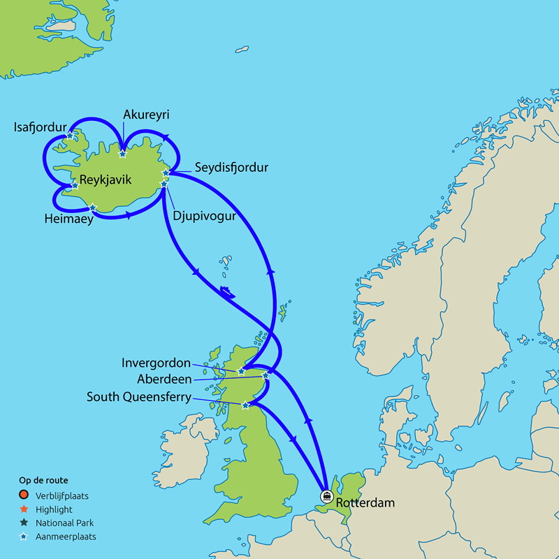 Bereid u voor op dramatische landschappen die bestaan uit kokende modderpoelen, spuitende geisers, gletsjers en watervallen. Reykjavik vormt het bruisende hart van uw cruise, maar ook de ongerepte Westmaneilanden en het schilderachtige Djupivogur maken diepe indruk. Als kers op de taart bezoekt u tijdens de cruise het schitterende Schotse stad Aberdeen, waar u misschien wel oog in oog komt te staan met een Schotse Hooglander, en UNESCO Werelderfgoed Edinburgh.